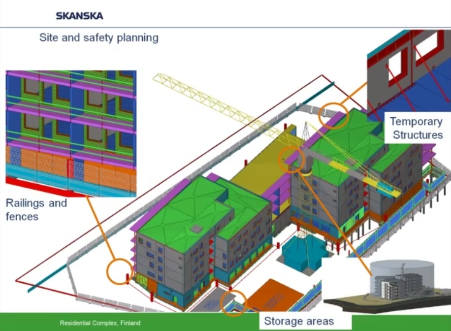 Asimismo, puede planificarse mucho mejor la colocación de elementos para la prevención de riesgos laborales, andamios, vallas, cierre de huecos de forjados, injerencia con grúas, señalización de zonas de trafico de maquinaria pesada.